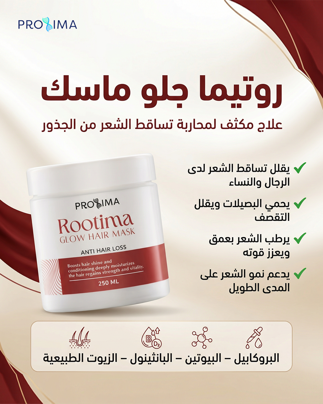 يعتبر روتيما جلو ماسك علاج مكثف للشعر مطور معمليا لمحاربة تساقط الشعر من جذوره. يساعد الماسك الغني بالبروكابيل والتي يتميز بتقنية مثبطات ديهدروتستوستيرون ،التي تعمل على منع تلف البصيلات وتقليل تساقط الشعر وتقصفه لدى الرجال والنساء على حد سواء. تم تطويره معمليا بالبيوتين والبانثينول والزيوت الطبيعية، التي تعيد ترطيب الشعر ويدعم نموه على المدى الطويل.